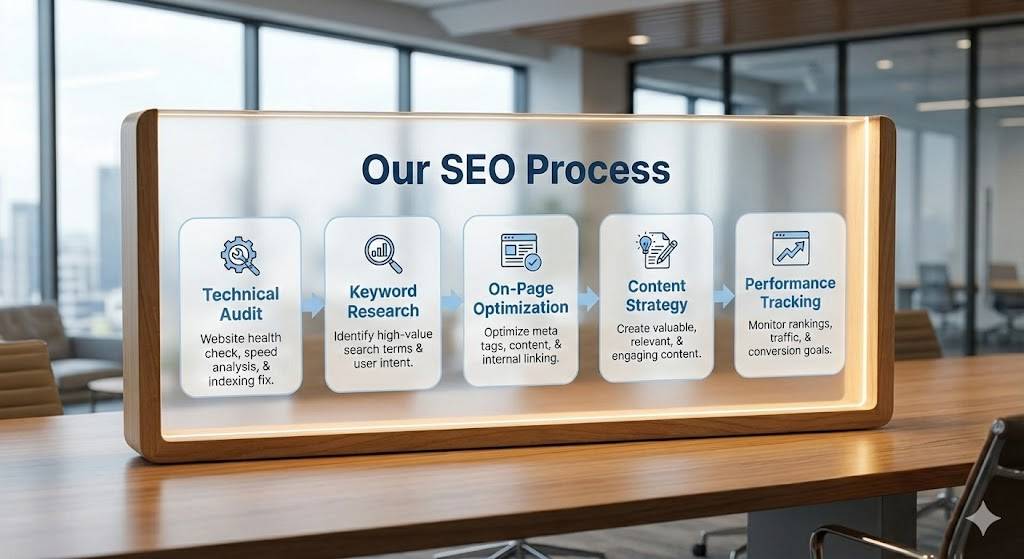 Our approach includes technical SEO audits, keyword research, on-page optimization, content strategy, and performance monitoring to help websites improve their rankings and generate qualified organic leads.